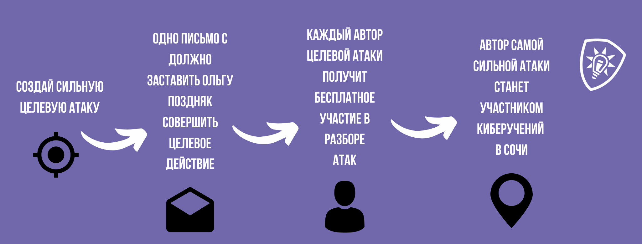 Итак, условия участия: необходимо создать целевую атаку, которая будет направлена на продюсера проектов КОД ИБ Ольгу Поздняк. Атака должна быть такой, чтобы Ольга Поздняк выполнила целевое действие. Предварительно, можно найти всю необходимую для атаки информацию в персональных соцсетях Ольги:
